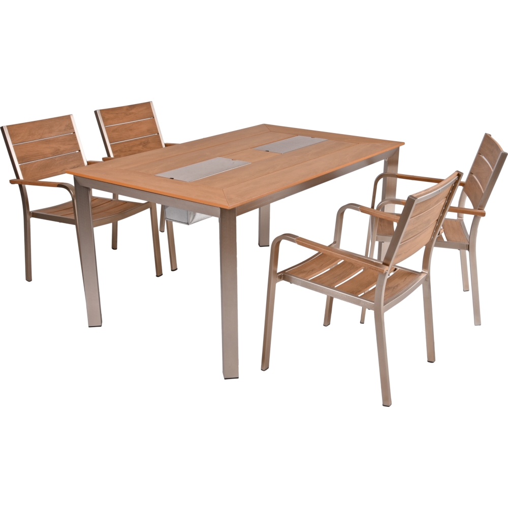 Die Tischgruppe FLORENCE mit Stapelstühlen ist eine praktische und ansprechende Lösung, um Ihren Außenbereich stilvoll und funktional zu gestalten. Dieses Set besteht aus einem Tisch FLORENCE mit zwei integrierten Eisbehältern und vier Stapelstühlen FLORENCE.
