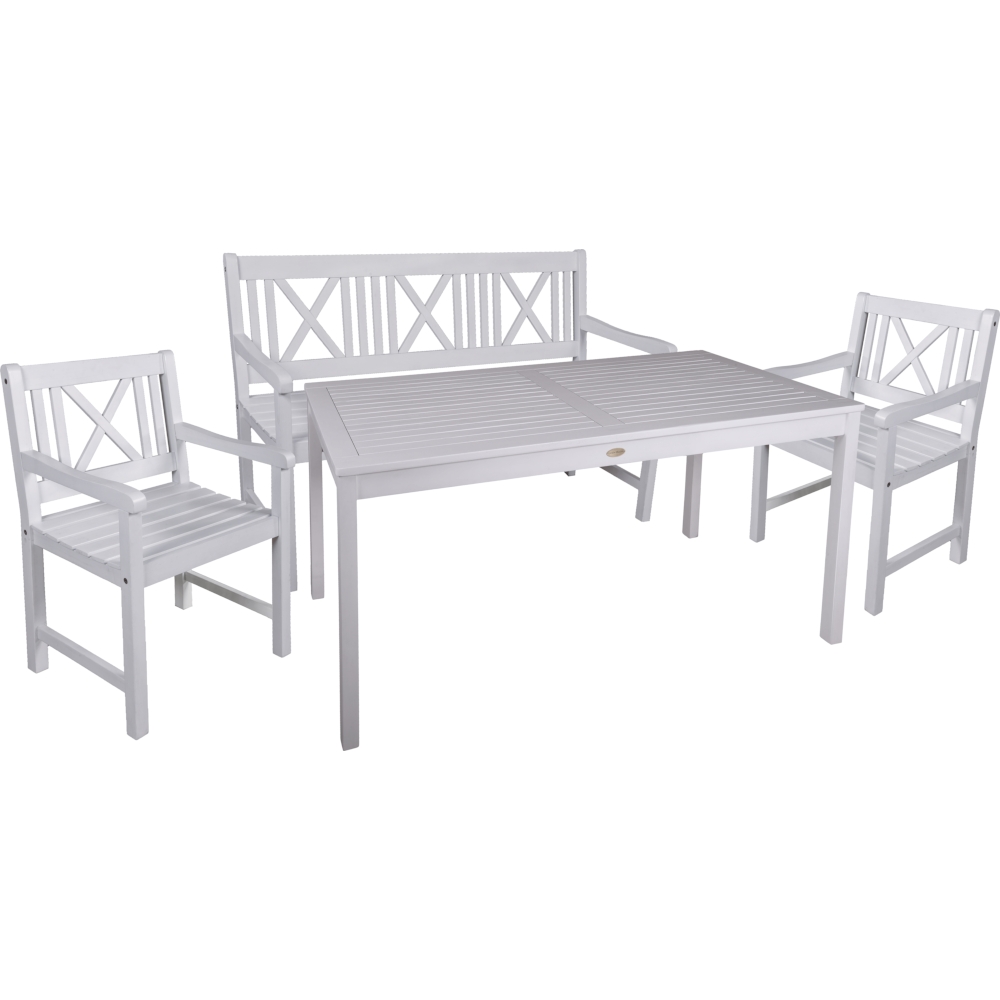 Die Gruppe umfasst auch die Bank MALMÖ, eine 3-Sitzer-Bank, ebenfalls aus Eukalyptus Grandis-Holz (FSC 100%) und im gleichen white washed Finish gestaltet. Die beiden Armstühle MALMÖ, ebenfalls aus Eukalyptusholz gefertigt, runden das Set ab. Dieses Set beinhaltet einen Tisch, zwei Stühle und eine Bank und schafft eine gemütliche Atmosphäre im Freien, perfekt für gesellige Momente mit Familie und Freunden. Die Tischgruppe MALMÖ vereint Qualität und Stil und bietet Ihnen eine stilvolle Möglichkeit, Ihren Außenbereich zu genießen.