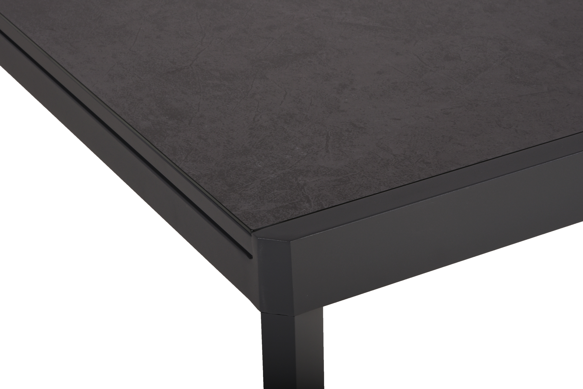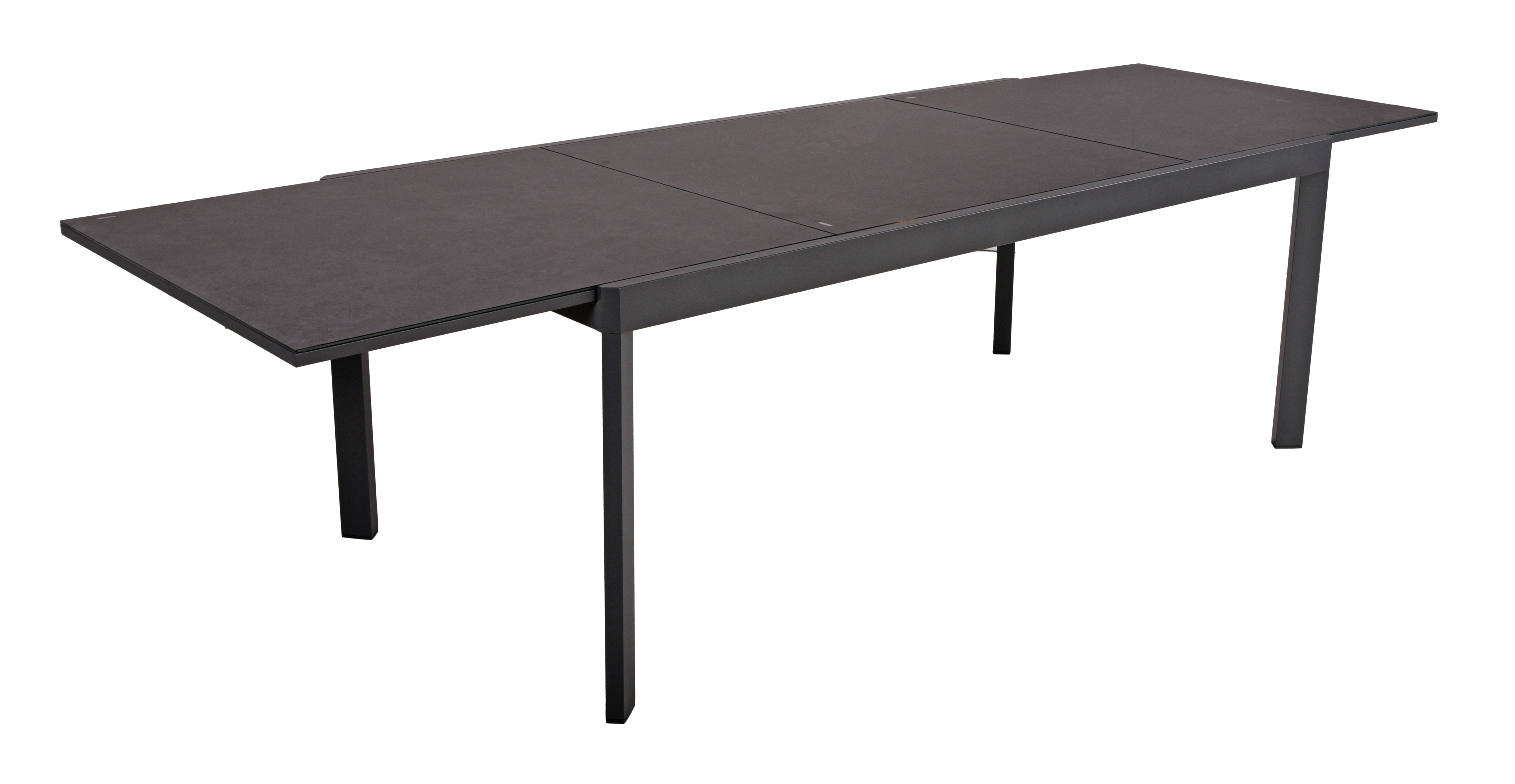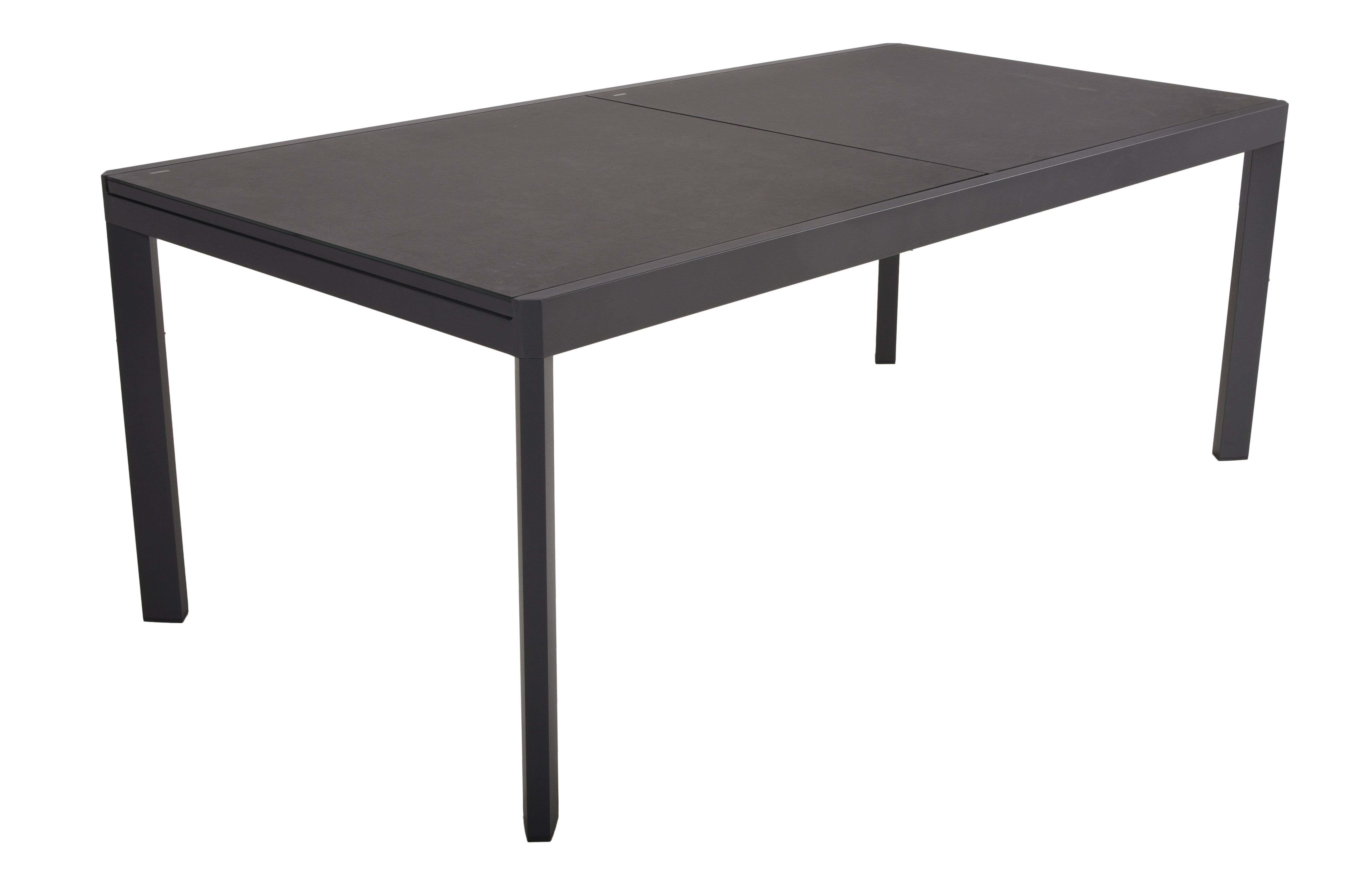 Der Ausziehtisch NEREA verfügt über ein robustes Gestell aus pulverbeschichtetem Anthrazit-Aluminium, was nicht nur für Stabilität, sondern auch für Wetterbeständigkeit sorgt. Die Tischplatte besteht aus Glas in Keramik-Optik, was nicht nur langlebig ist, sondern auch eine elegante Ästhetik bietet. Der Ausziehmechanismus des Tisches, der sich unterhalb der Tischplatte befindet, ermöglicht es Ihnen, die Tischgröße je nach Bedarf anzupassen, um mehr Gäste zu empfangen oder zusätzlichen Raum freizugeben.