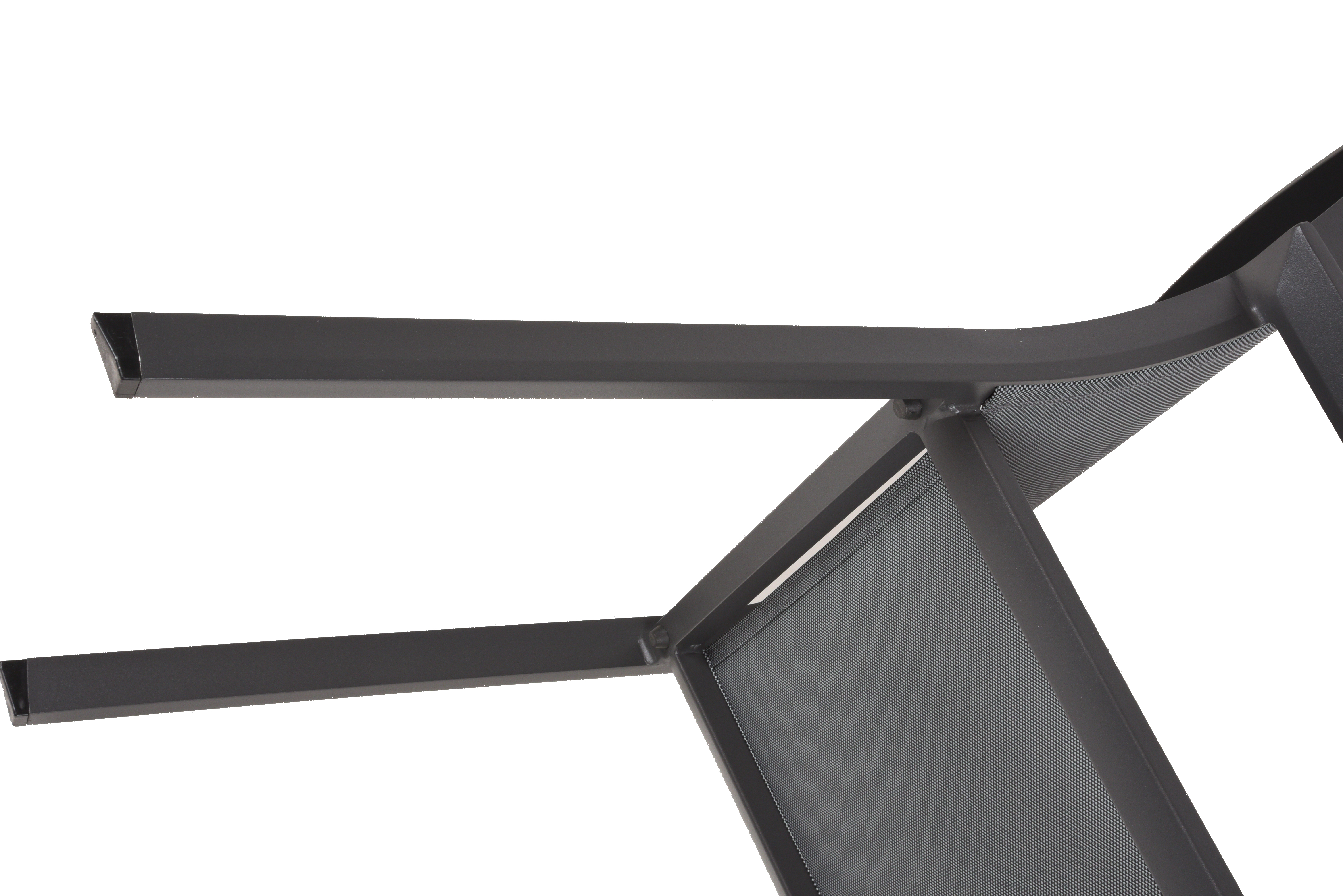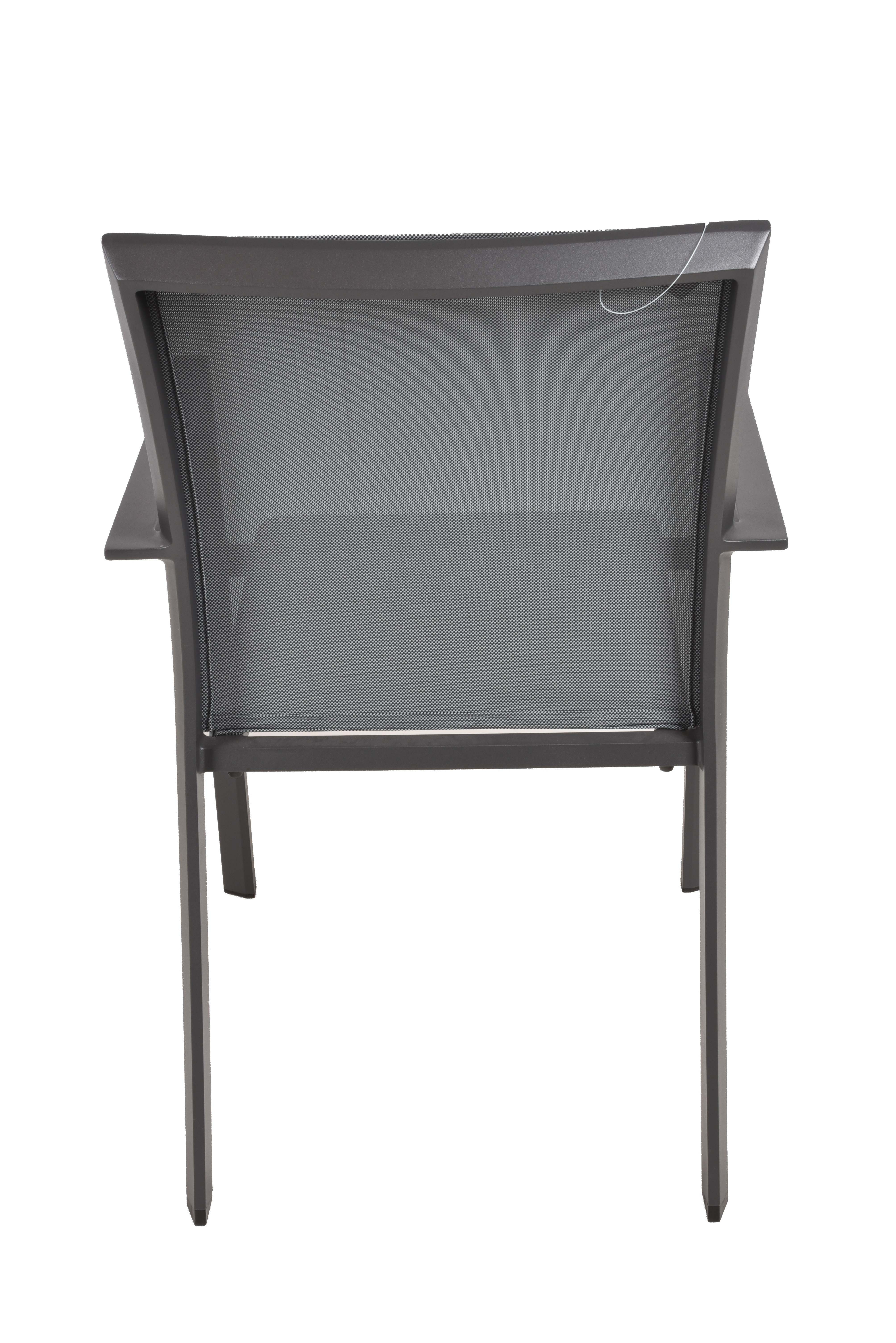 Die sechs Stapelstühle RANA sind speziell für platzsparende Lagerung konzipiert und verfügen über ein pulverbeschichtetes dunkelgraues Aluminiumgestell und Sitzflächen aus mittelgrauem Kunststoffgewebe mit einem 2x2-Muster. Dieses Gestell ist leicht und dennoch stabil und sorgt für Langlebigkeit. Die Stühle können einfach gestapelt und gelagert werden, wenn sie nicht in Gebrauch sind.