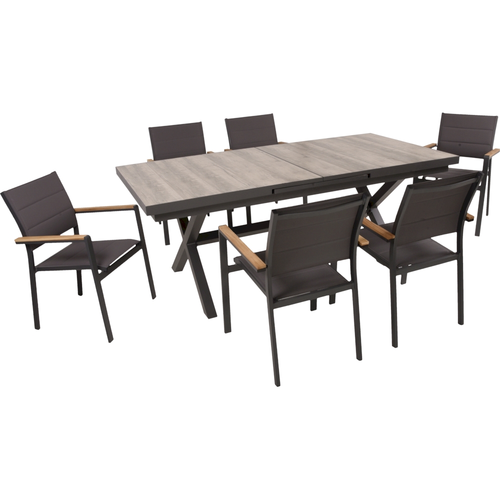 Die sechs Stapelstühle ELENA sind mit einem anthrazitfarbenen Aluminiumrahmen und einem dunkelgrauen Kunststoffgewebe bezogen. Die Stühle bieten einen hervorragenden Sitzkomfort und verfügen über Armlehnen aus Teakholz mit FSC 100% Zertifizierung, die einen eleganten Kontrast zum modernen Design der Stühle bieten. Dank ihrer Stapelfunktion können die Stühle bei Bedarf platzsparend verstaut werden. Dieses Set enthält einen Ausziehtisch und sechs Stühle und ist ideal für Outdoor-Mahlzeiten und Unterhaltung mit Familie und Freunden geeignet.