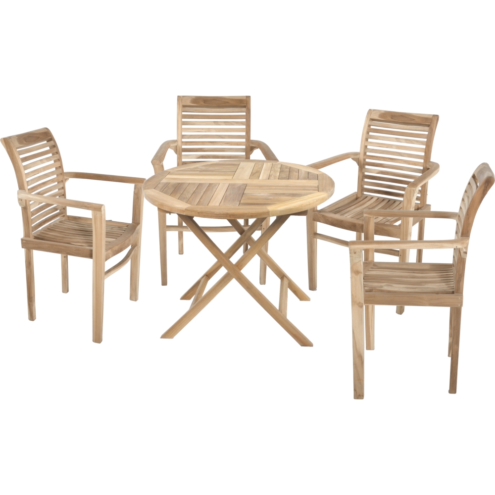 Die Tischgruppe SOLO/JAVA ist eine vielseitige und praktische Outdoor-Möbelset, die aus einem klappbaren runden Teaktisch SOLO und vier Stapelstühlen JAVA mit Armlehnen besteht. Der Tisch SOLO bietet eine großzügige Fläche von Ø90 cm und ist aus hochwertigem Teakholz gefertigt, das natürliche Schönheit und Langlebigkeit verleiht. Das Klappdesign ermöglicht es Ihnen, den Tisch bei Bedarf platzsparend zu verstauen.