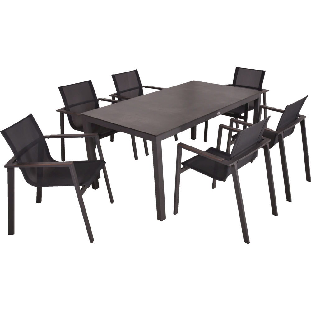 Dieses Set enthält sechs Stühle und einen Tisch, die perfekt aufeinander abgestimmt sind und eine moderne und komfortable Esslösung für Ihre Outdoor-Mahlzeiten bieten.