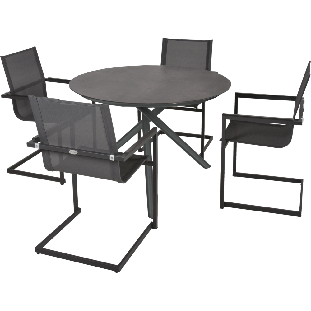 Dieses Set enthält einen Tisch und vier Freischwinger-Stühle, die perfekt aufeinander abgestimmt sind und eine moderne und komfortable Sitzlösung für gesellige Mahlzeiten im Freien bieten.