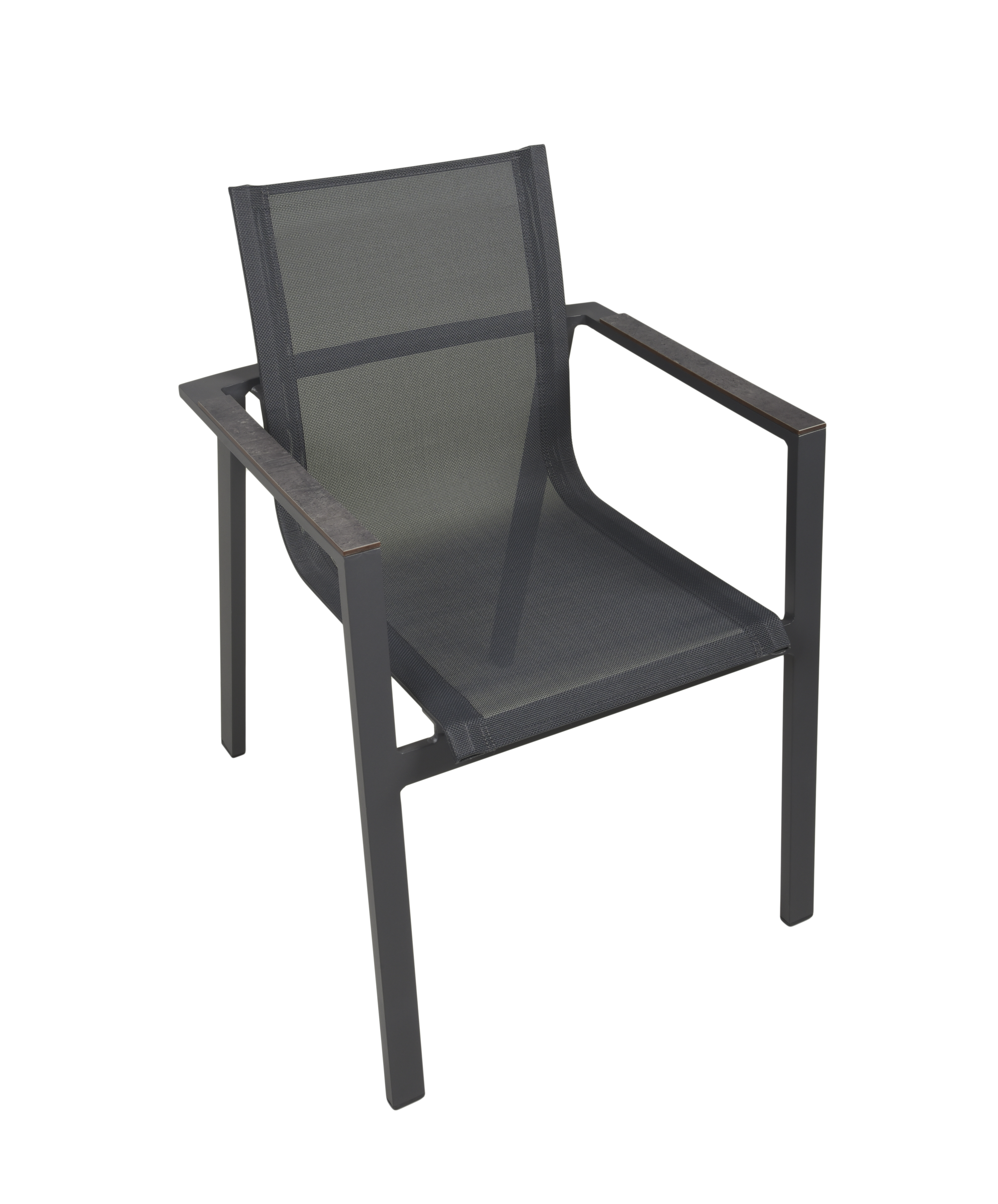 Die Stapelstühle SOPHIA sind aus pulverbeschichtetem Aluminium in derselben ansprechenden Farbe gefertigt und mit pfefferschwarzem (Industrial) Kunststoffgewebe 2x2 bezogen.