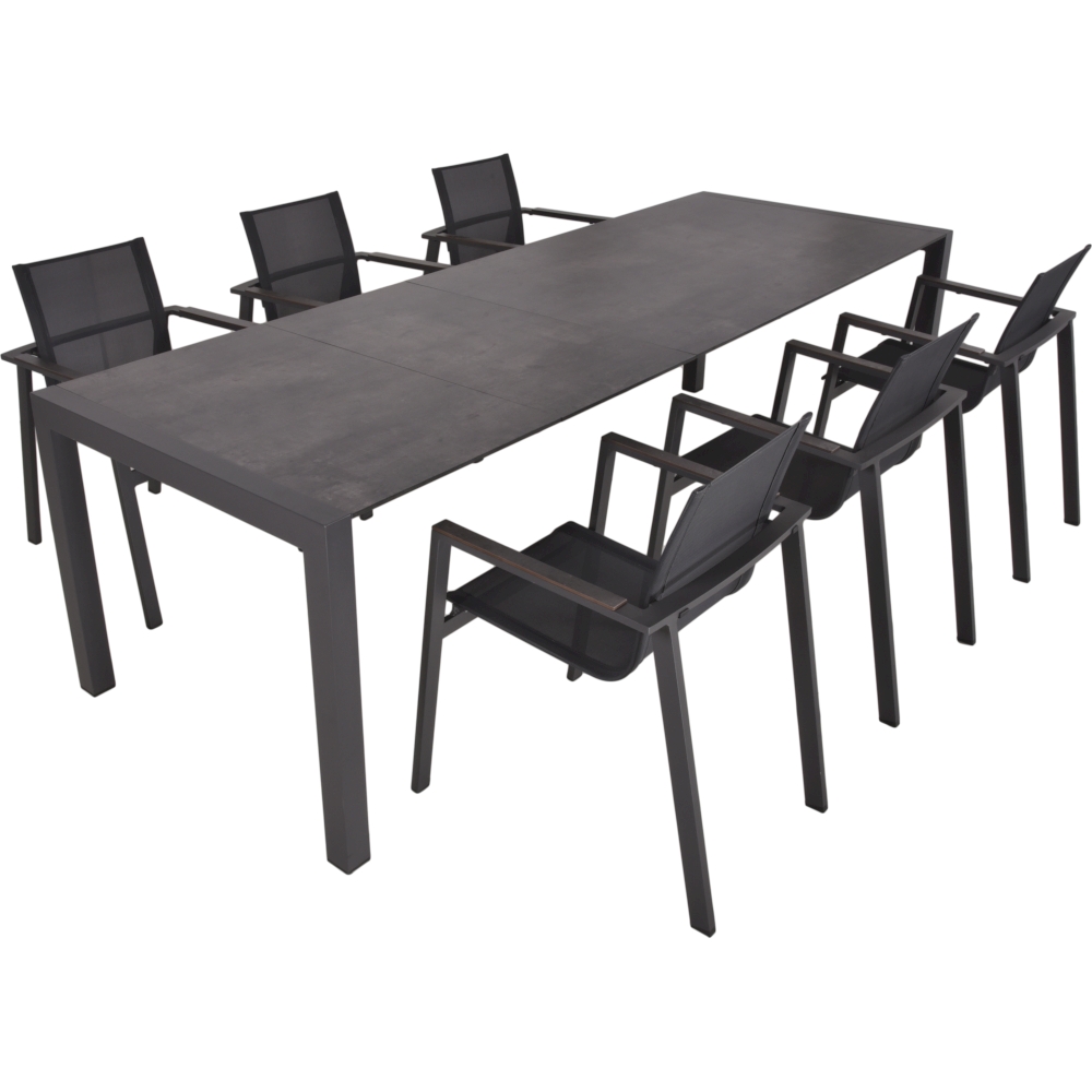 Dieses Set enthält einen Ausziehtisch und sechs Stapelstühle, die perfekt aufeinander abgestimmt sind und eine moderne und bequeme Sitzlösung für Ihre Outdoor-Mahlzeiten bieten.