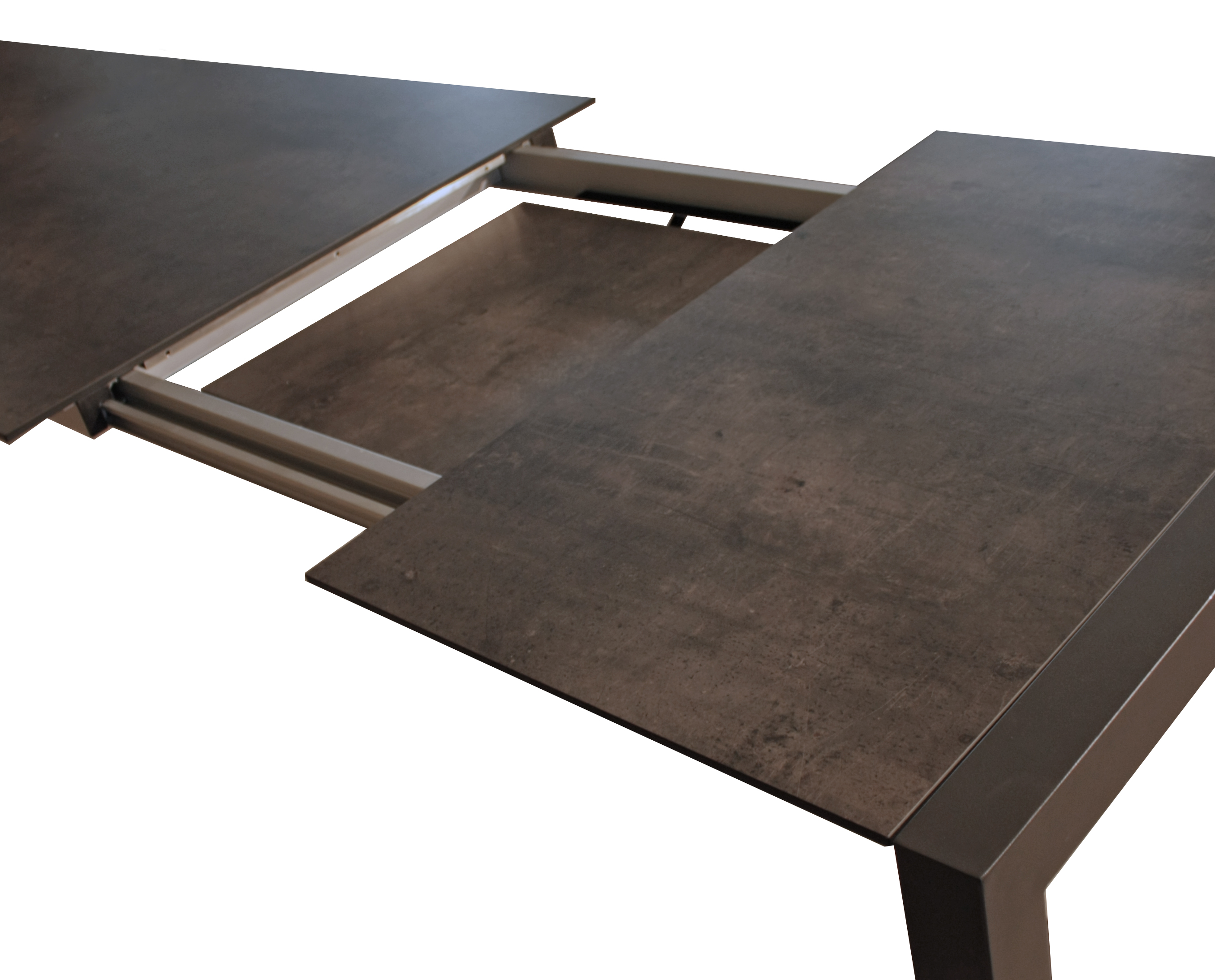 Der Ausziehtisch SOPHIA besteht aus strapazierfähigem pfefferschwarzem (Industrial) Aluminium, das pulverbeschichtet ist, und verfügt über eine dunkelbraune Kunststoff HPL-Tischplatte in Grau.