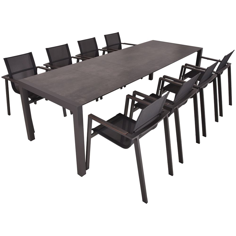 Dieses Set enthält einen Ausziehtisch und acht Stapelstühle, die perfekt aufeinander abgestimmt sind und eine moderne und bequeme Sitzlösung für Ihre Outdoor-Mahlzeiten bieten.
