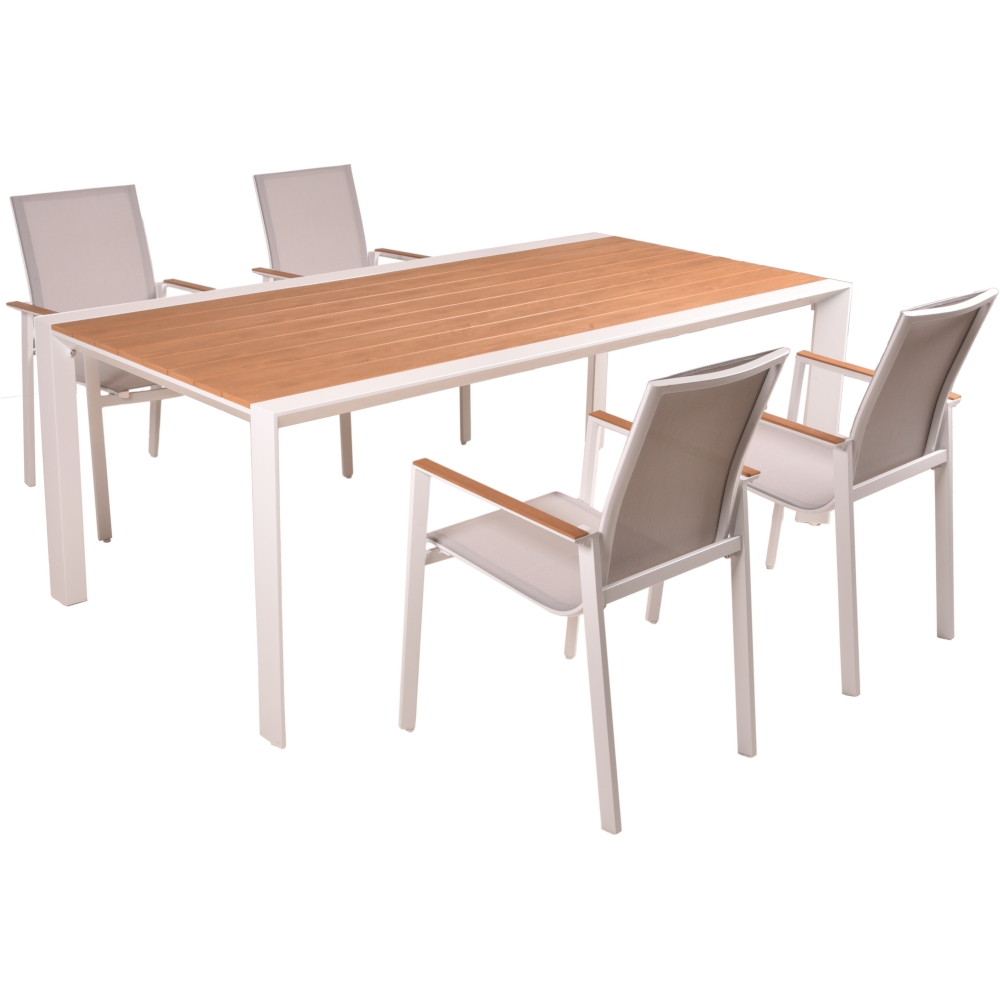 Die Tischgruppe VENICE bietet die perfekte Kombination aus Eleganz und Funktionalität für Ihren Außenbereich. Der Tisch VENICE, hergestellt aus pulverbeschichtetem weißem Aluminium und mit einer Tischplatte aus natürlichem Nonwood, besticht durch sein modernes Design und seine Strapazierfähigkeit.