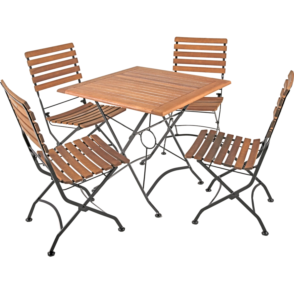 Das Set umfasst einen geräumigen Tisch und vier klappbare Stühle, die sich platzsparend verstauen lassen.