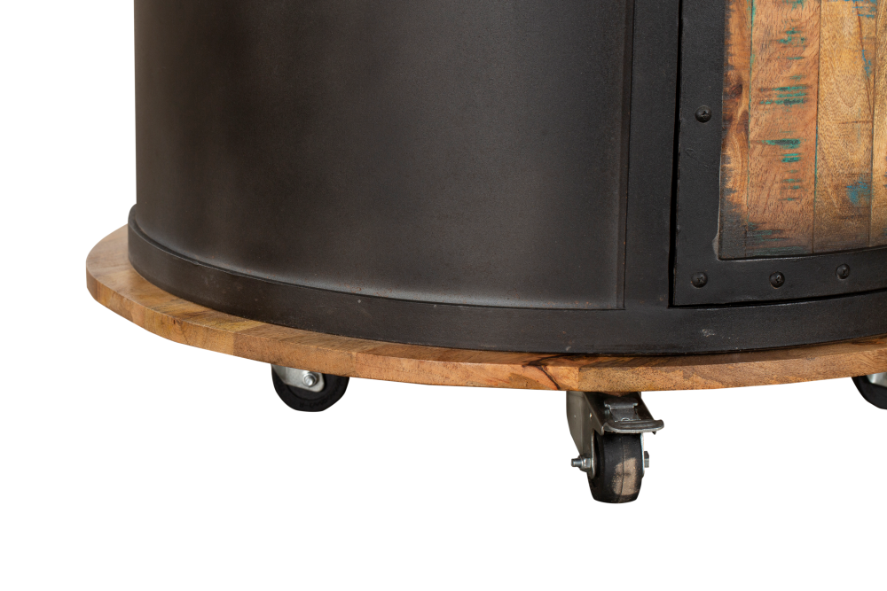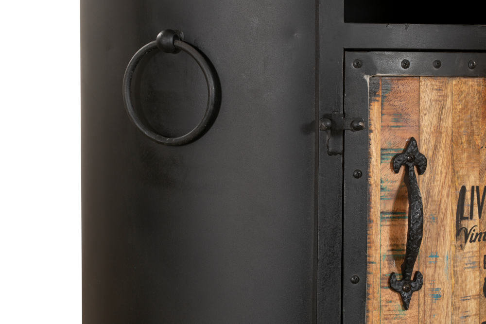 Der Artikel ist aus schwarzem Stahl (pulverbeschichtet) hergestellt und die Türen (mit Aufdruck: LIVINGSTON – Vintage Label) sowie die Top & Bodenplatte sind aus massivem recyceltem Mangoholz.